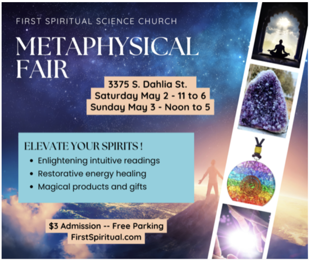 May 2nd & 3rd, FSSC Spring Holistic Fair, Saturday 11am to 6pm, Sunday Noon to 5pm. 3375 South Dahlia St, Denver, CO 80222. Free Parking